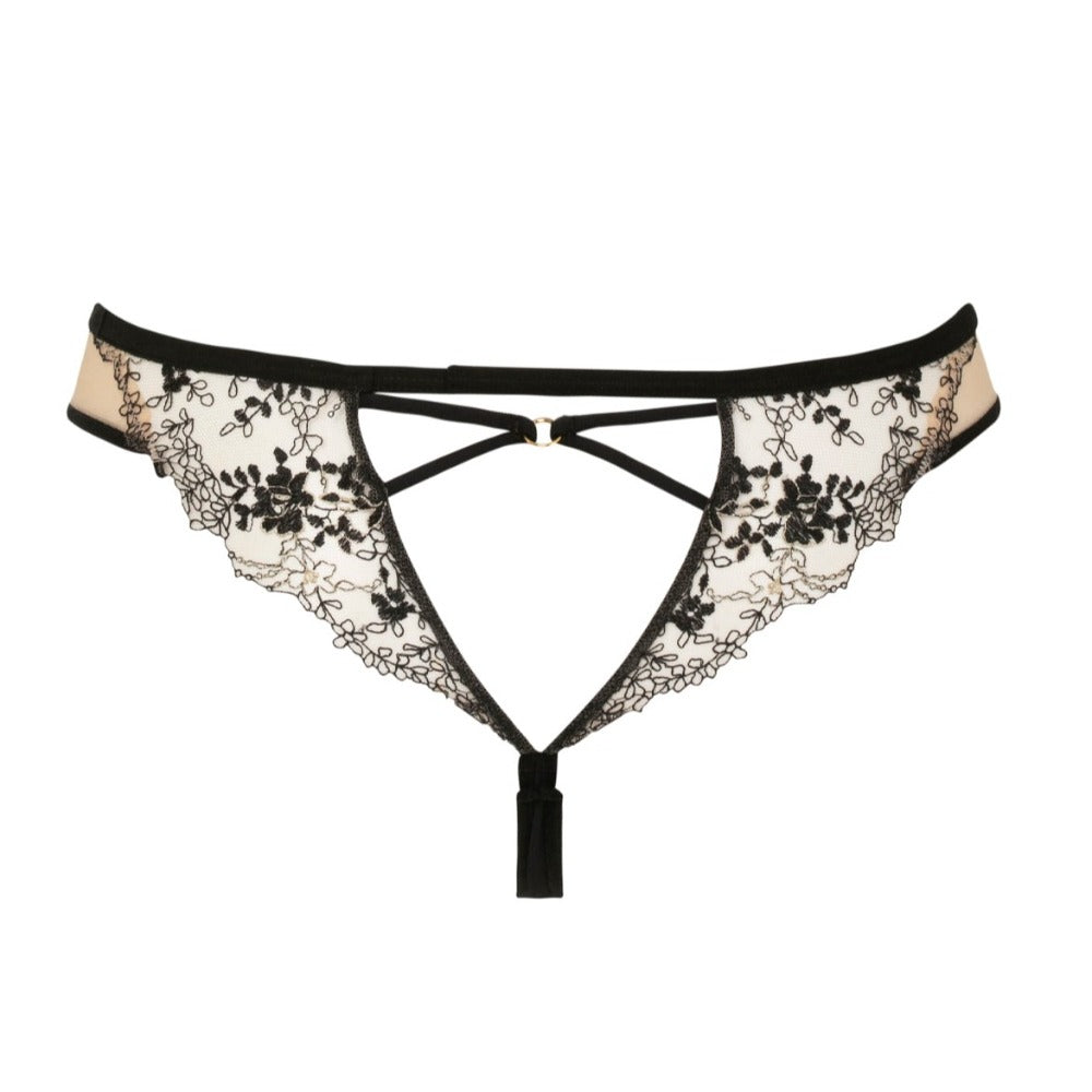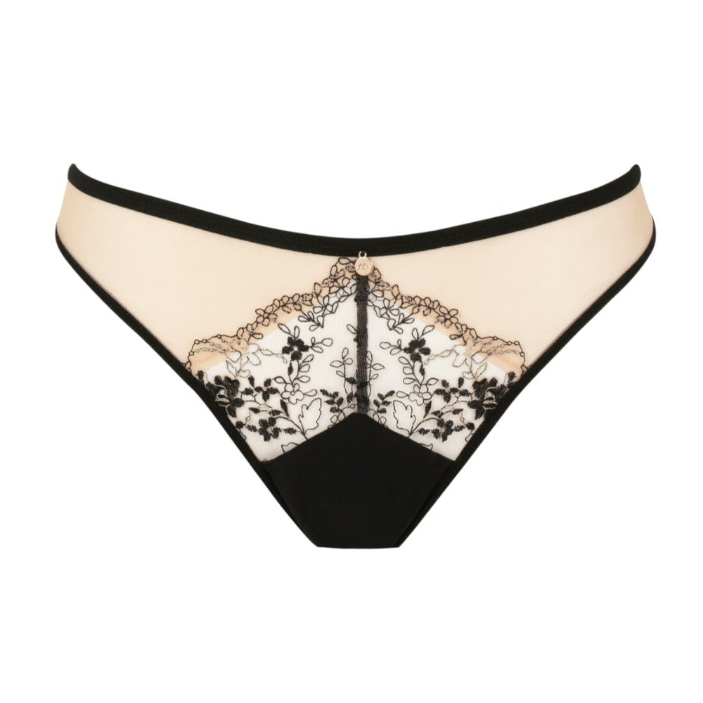 Tanga panty with superimposed floral on the front in black mesh, nude tulle and a magnificent black floral embroidery on a nude background.