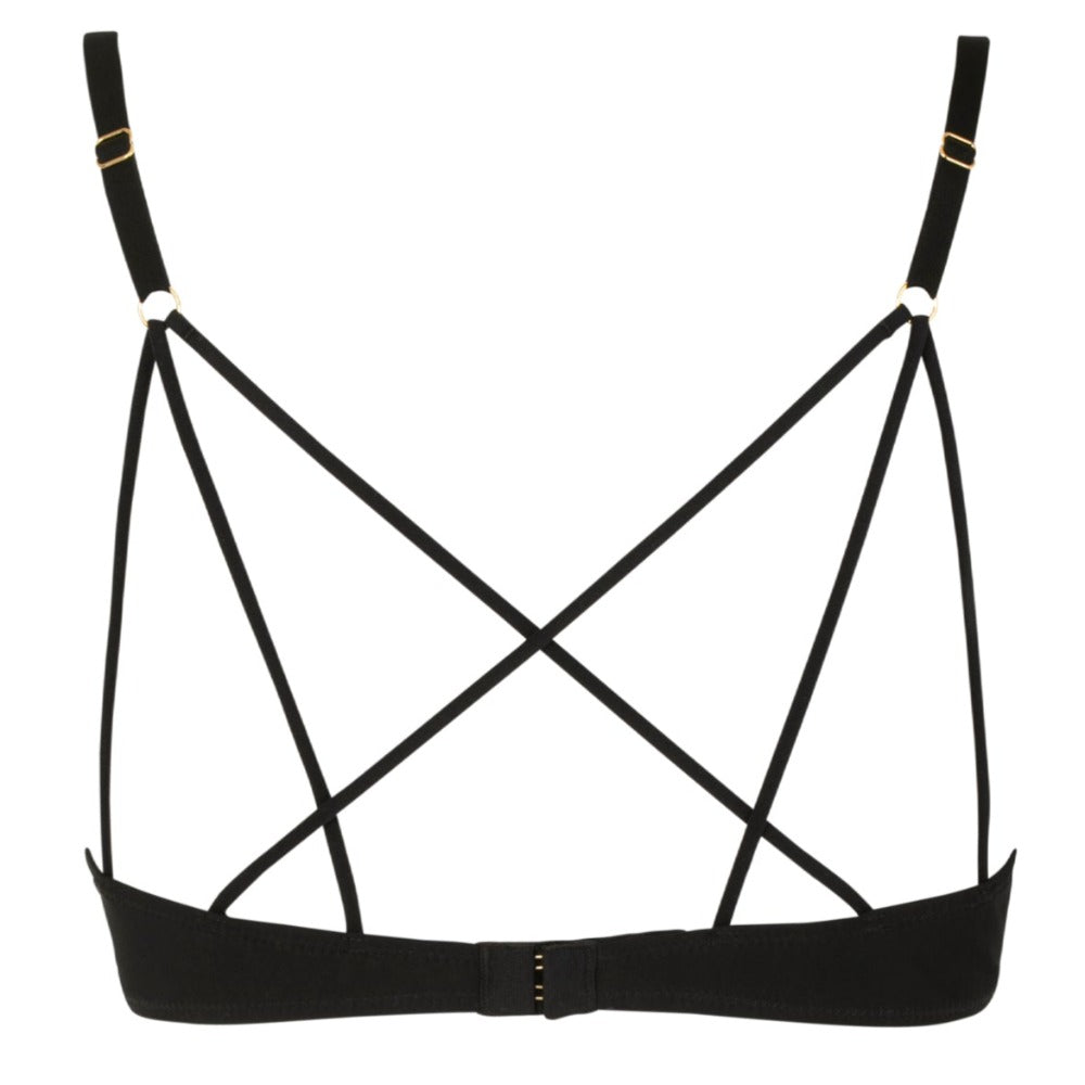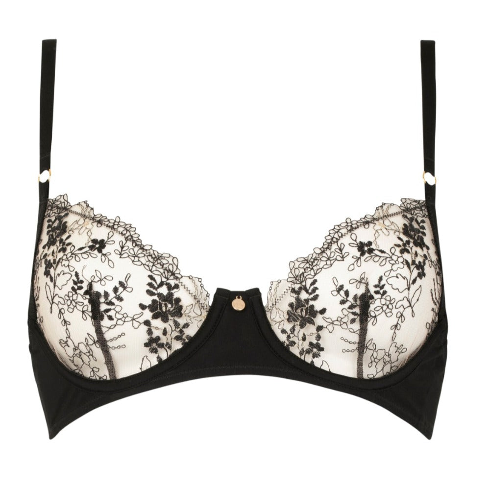 Sheer cups with black floral embroidery on a flesh background framed by a soft black band. Beautiful criss-crossed back.