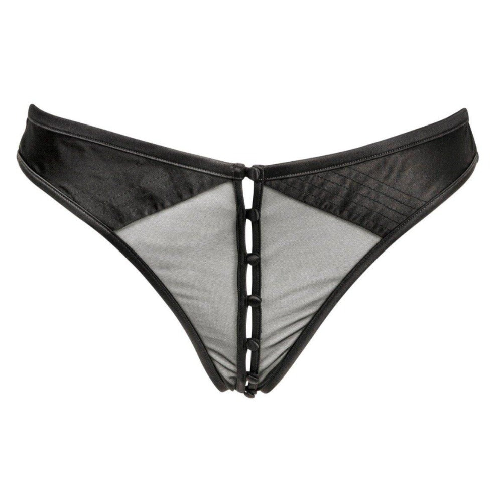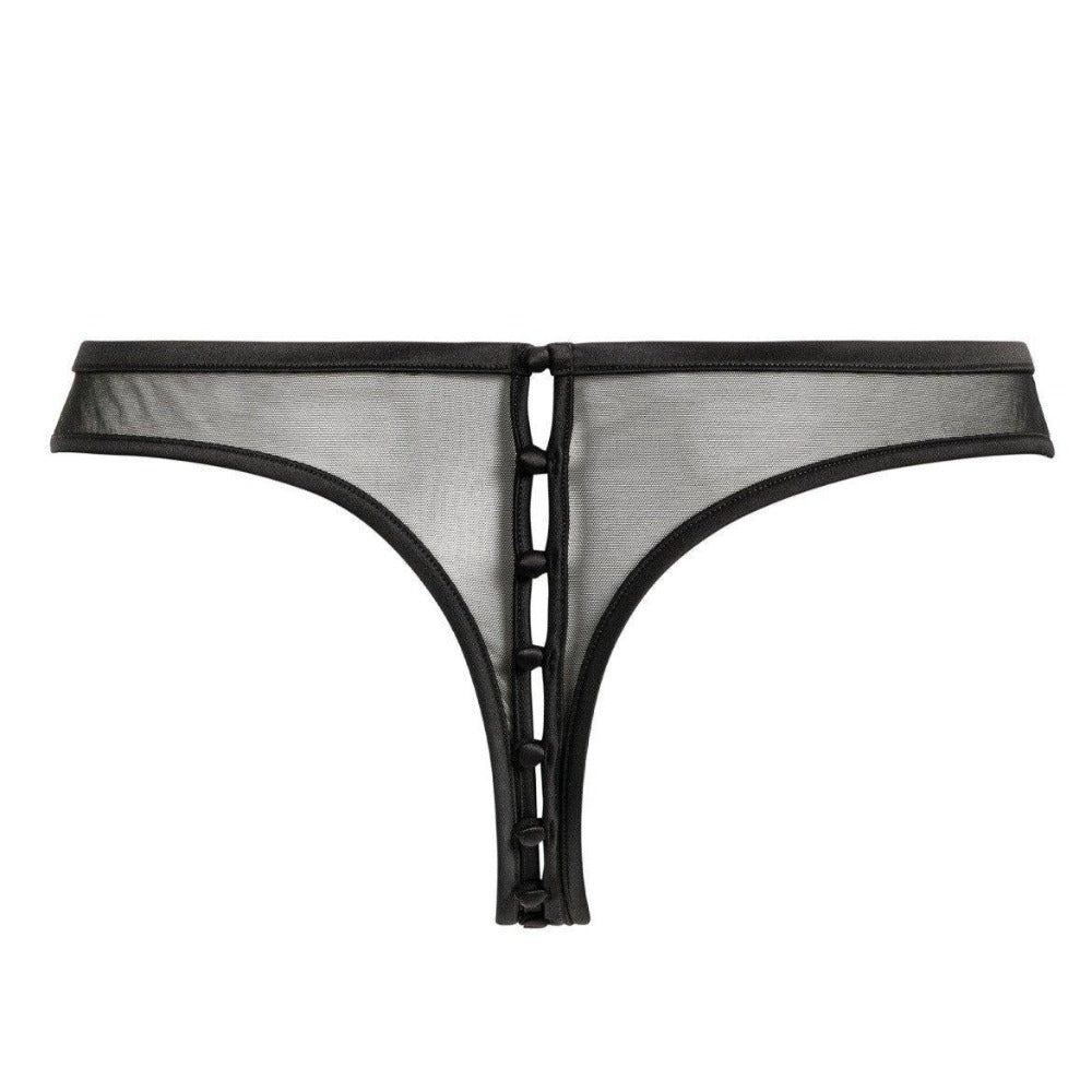 This open thong offers a perfect alliance between elegance and eroticism. Sheer tulle, satin, delicate topstitching and small openable buttons lend great sensuality to this must-have piece.