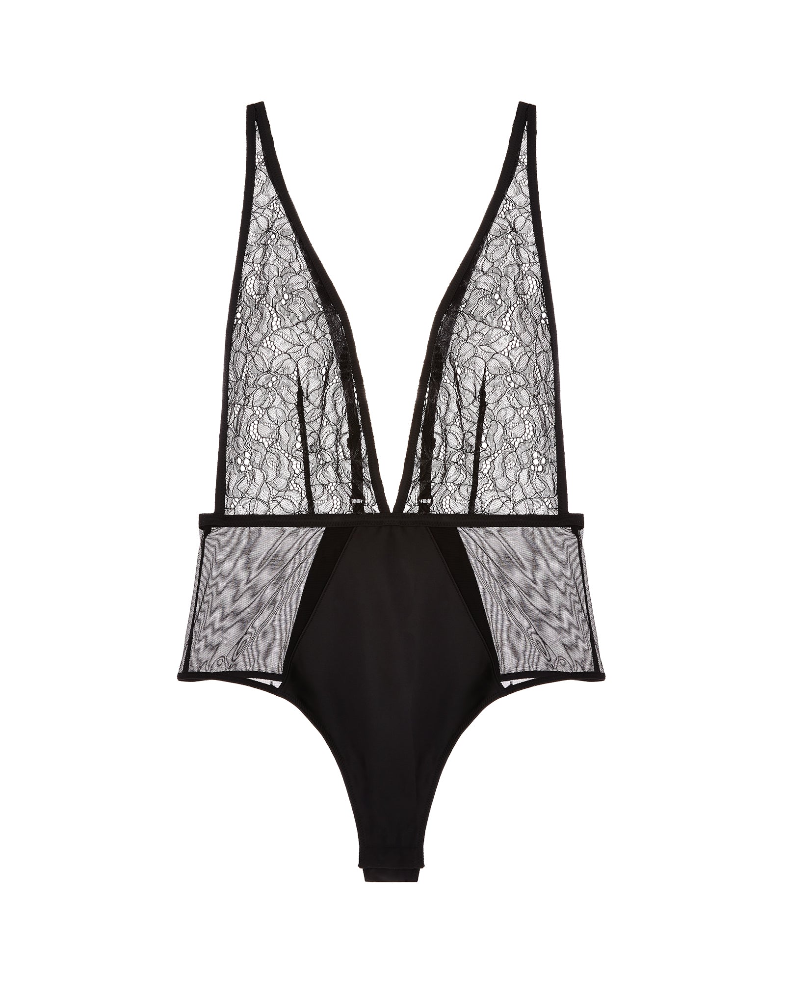Embrace your curves with the Lexi Bodysuit. Made with stretch lace for the upper panels and a satin bottom with mesh inserts for a revealing look. Complete with a deep plunge neckline and open back, with adjustable straps and a thong back.