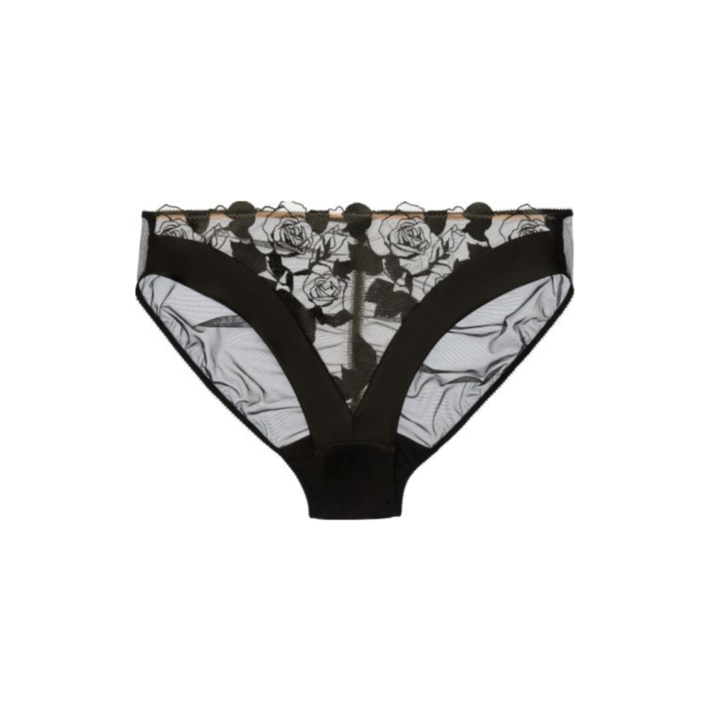 The Rosabelle Bikini features a rose embroidery on a soft tulle. Trimmed with satin banding and features a stretch mesh.