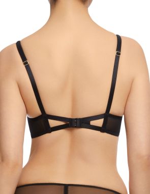 Underwired, sheer cup embroidered bra with dramatic detailing. A sheer support sling in the bra cup ensures lift and shape without bulk. Satin straps and ribbon trims.