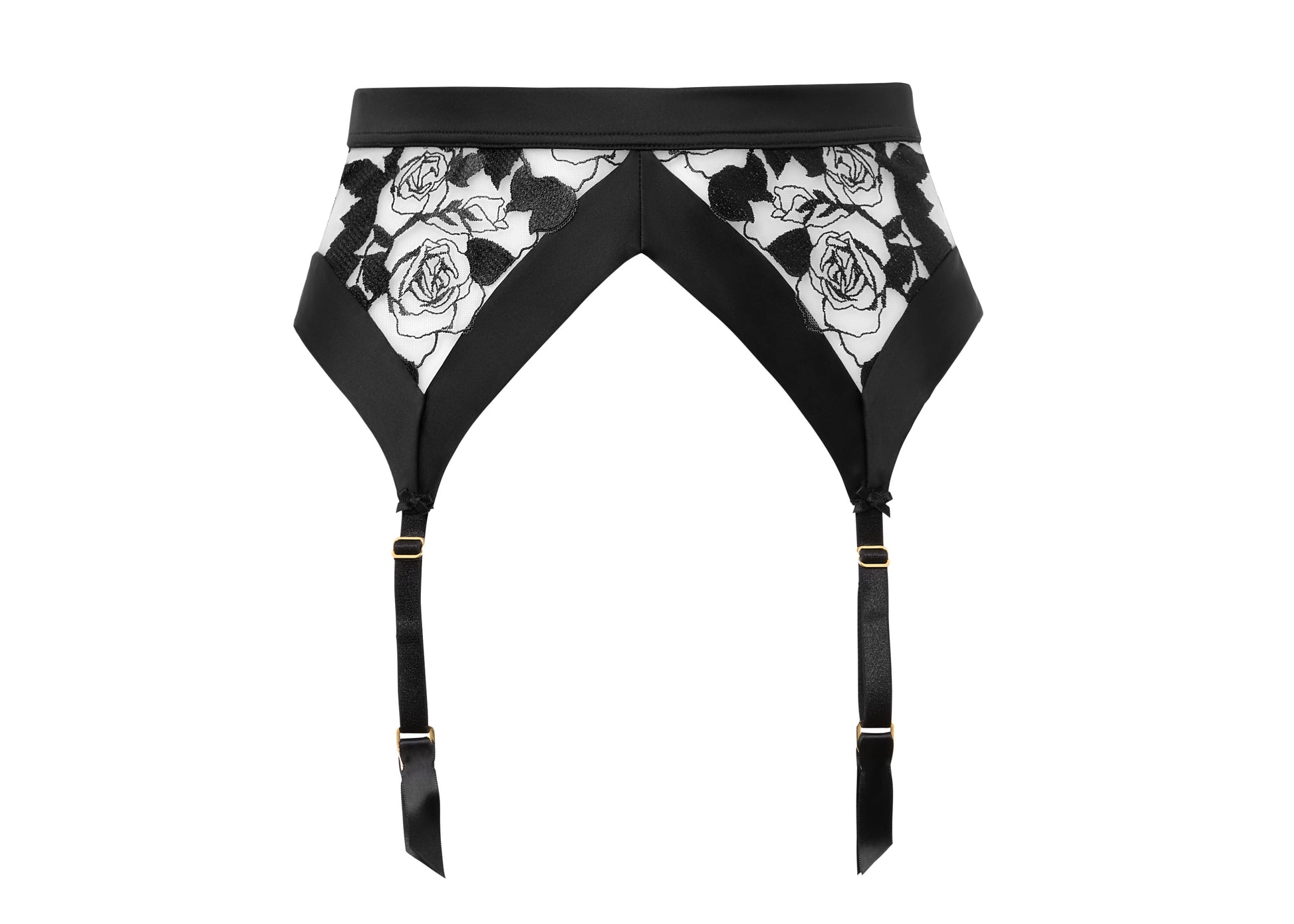 This suspender features dramatic rose embroidery on soft tulle with satin banding trim detail and 4 garter attachments.