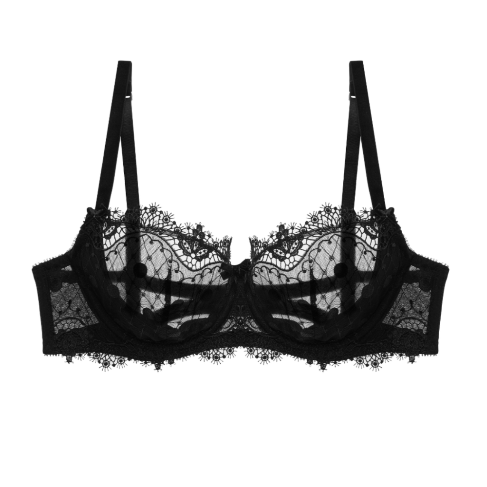 Embroidered detailing on soft tulle bases. The detailed embroidery is dramatic against the soft mesh. The bra is a sheer cup bra with soft subtle lift from the unique satin petal inserts. The straps are velvet with velvet bow trims.