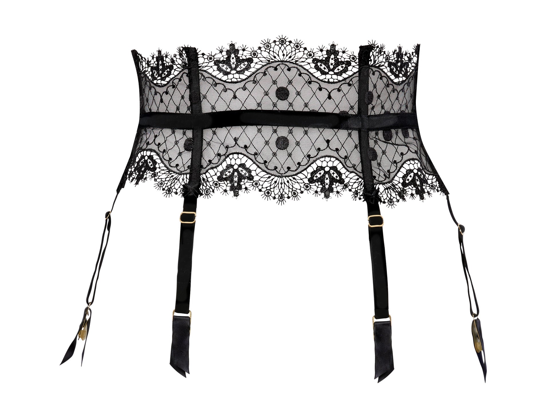 The Vedette suspender features a wide embroidered front which sits high at the waist. The suspender had 6 velvet garters for stability and function.